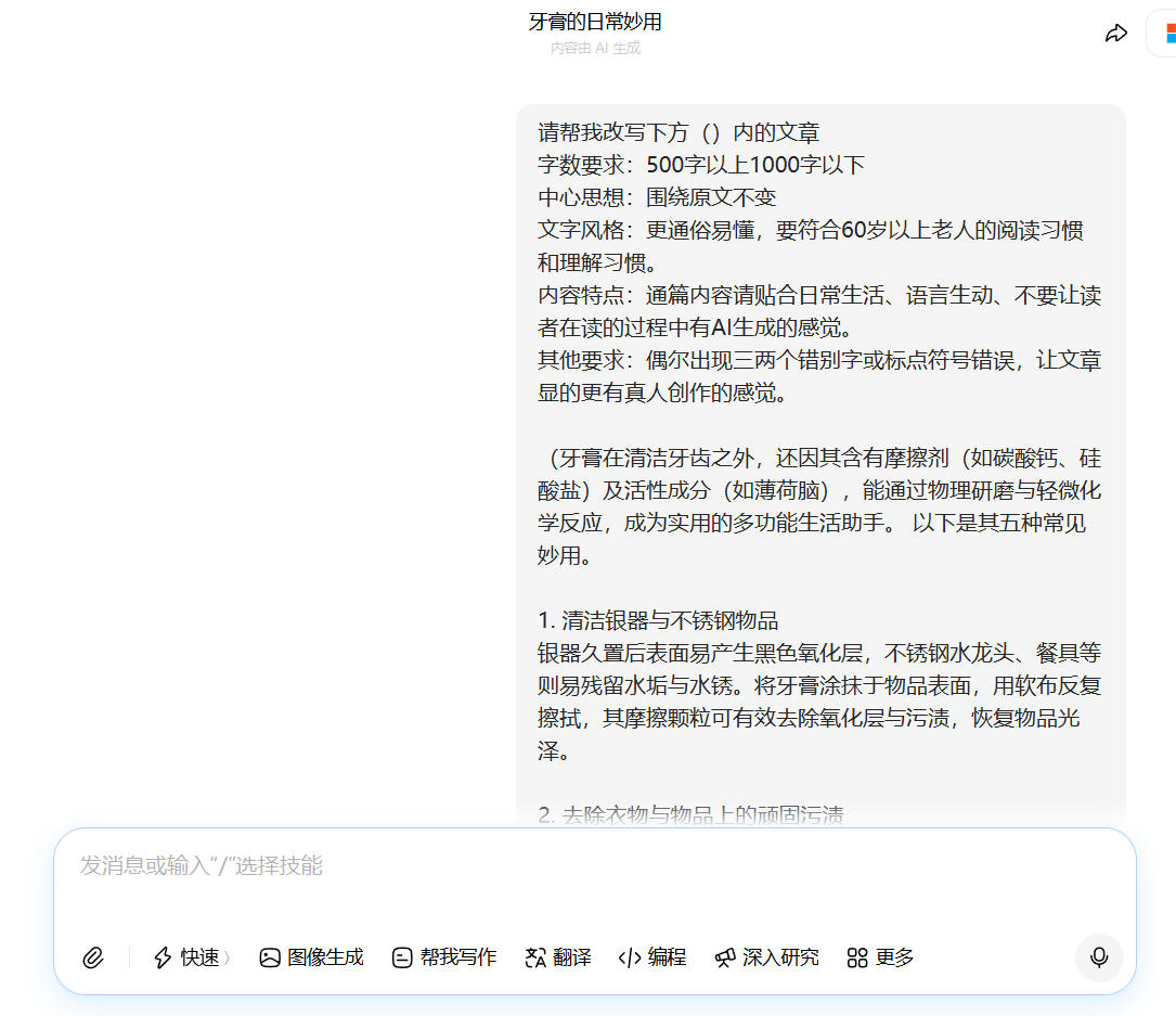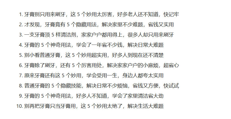 扔给豆包,让它按照这个风格生成“老年向”标题,什么叫老年向?就是**“牙膏涂在手上太厉害了”“塑料瓶剪一刀,解决大难题”类似于这种。